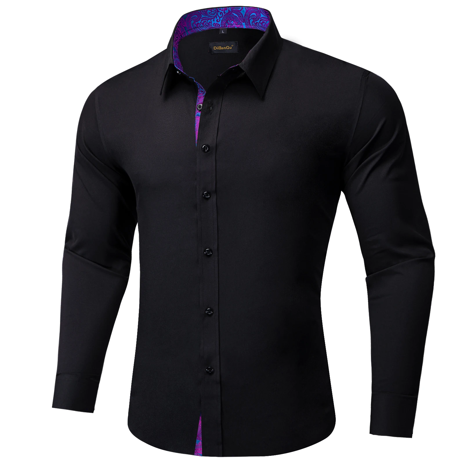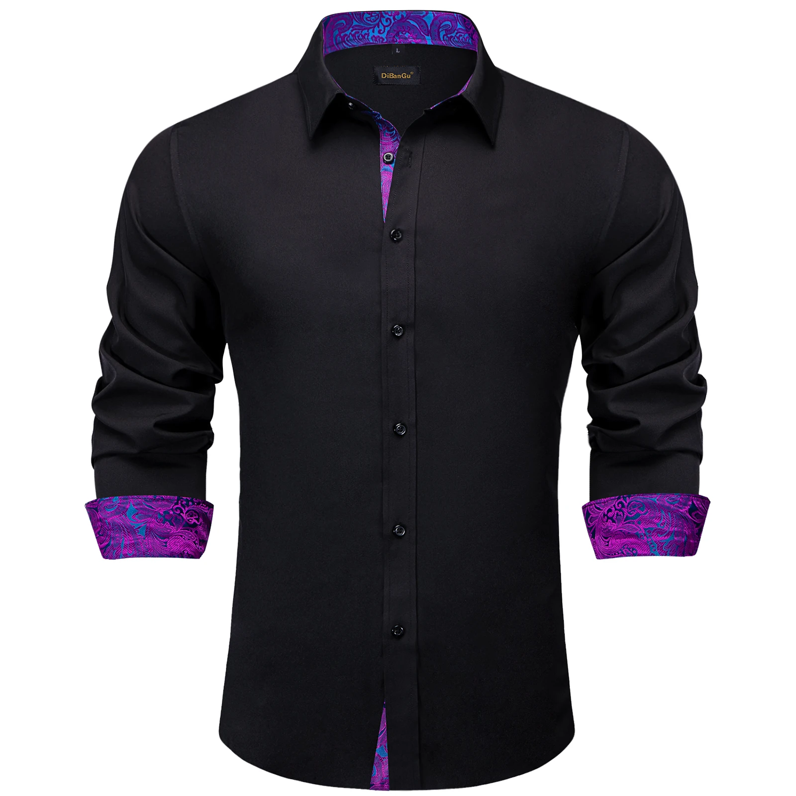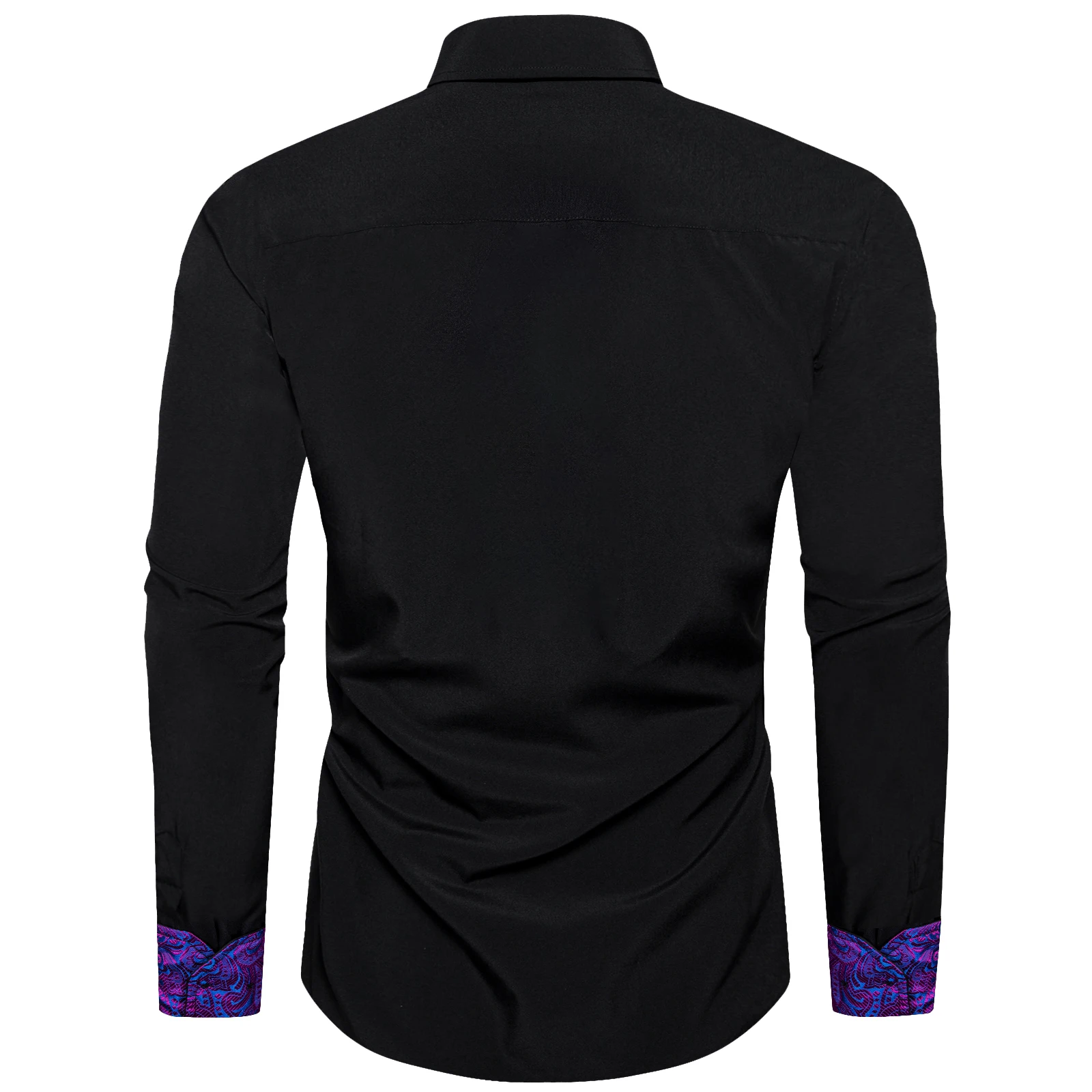 Men Shirts Long Sleeve Black Solid with Purple Contrast Color Collar and Cuff Fashion Casual Shirts Blouse for Wedding Praty
