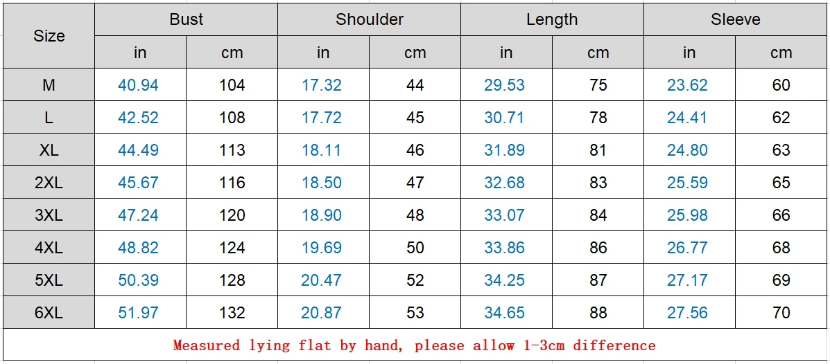 size_info: {"sizeInfoList":[{"length":{"cm":"104","inch":"40.94"},"size":"M","vid":-1},{"length":{"cm":"108","inch":"42.52"},"size":"L","vid":-2},{"length":{"cm":"113","inch":"44.49"},"size":"XL","vid":-3},{"length":{"cm":"116","inch":"45.67"},"size":"XXL","vid":-4},{"length":{"cm":"120","inch":"47.24"},"size":"XXXL","vid":-5},{"length":{"cm":"124","inch":"48.82"},"size":"4XL","vid":-6},{"length":{"cm":"128","inch":"50.39"},"size":"5XL","vid":-7},{"length":{"cm":"132","inch":"51.97"},"size":"6XL","vid":-8}]}