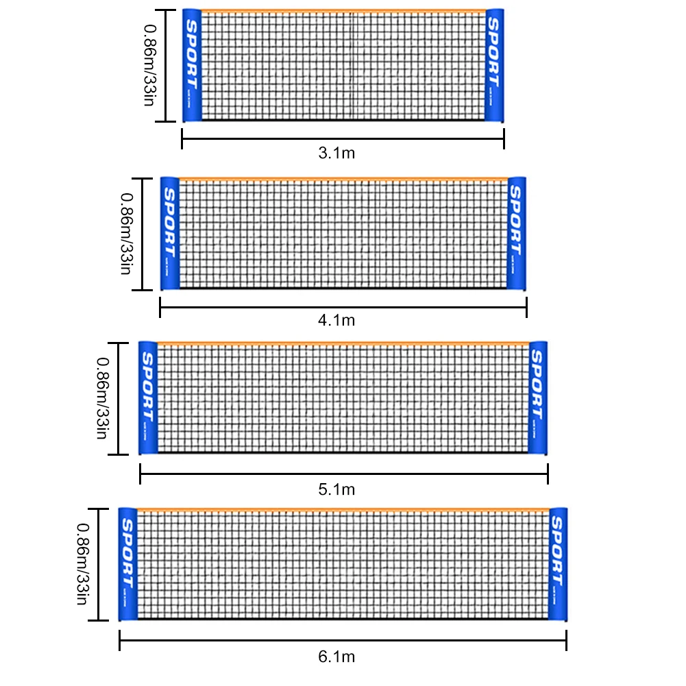 Feature: 1. Widely used: playing badminton, volleyball, tennis, football and pick ball. Ideal for parties, camping and family vacations. 2. Multi-purpose: suitable for indoor and outdoor. Suitable for players of all climates and levels. 3. Can be quickly assembled and disassembled. You can play badminton, tennis, volleyball or other sports anytime and anywhere. Specification: Name: Badminton Net Material: Nylon, Polyester Size: 3.1*0.86m/120*33in, 4.1*0.86m/160*33in, 5.1*0.86m/200*33in, 6.1*0.86m/240*33in Note: 1. Due to the different monitor and light effect, the actual color of the item might be slightly different from the color showed on the pictures. Thank you! 2. Please allow about 1-2cm measuring deviation due to manual measurement. ![]()