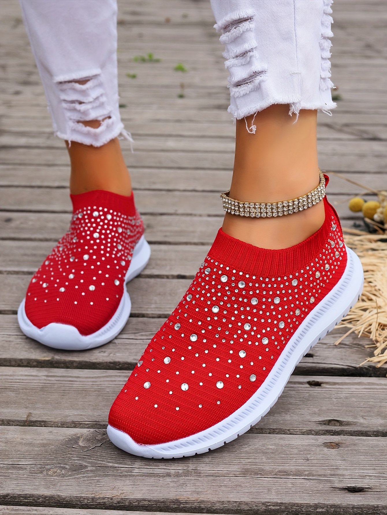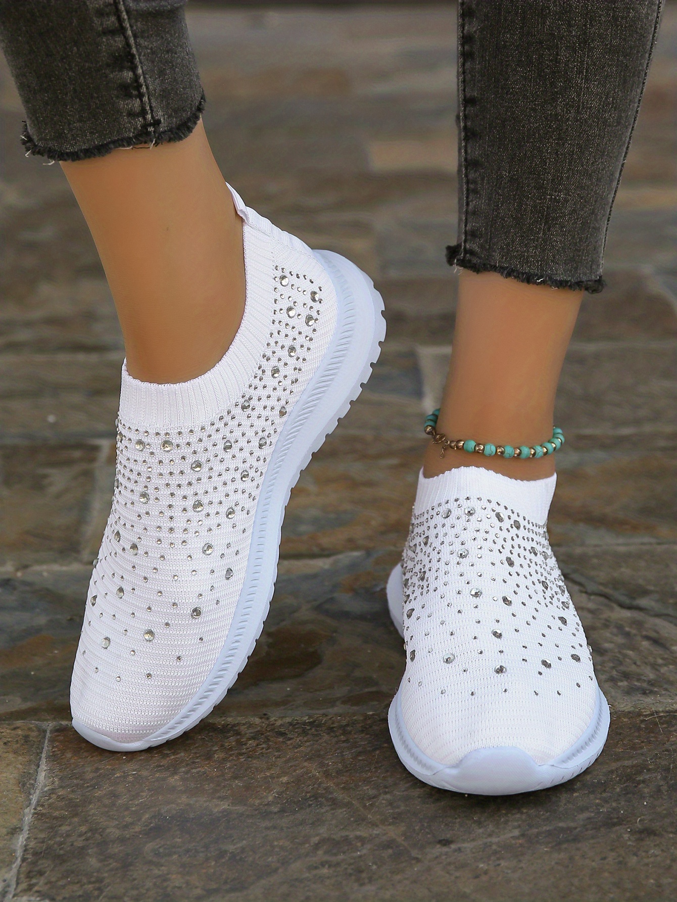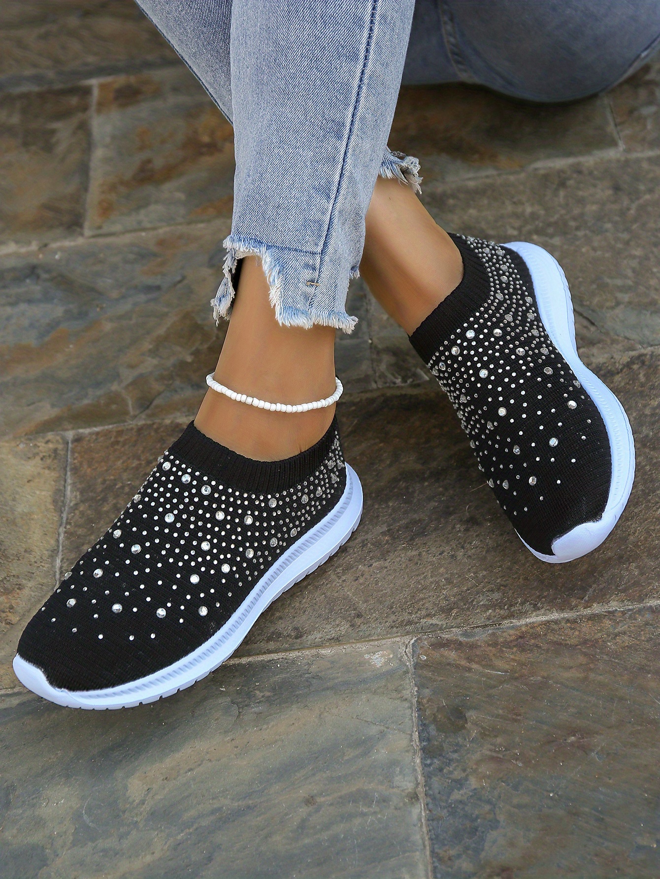 Women's Rhinestone Decor Slip-on Sneakers, Fly Woven Sports Shoes, Breathable Low Top Walking Shoes For Music Festival